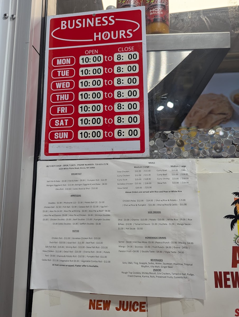 Welcome to Ali's Roti Shop, a cherished gem in the Bronx, NY, specializing in authentic Caribbean flavor. This cozy spot is a must-visit for lovers of Trinidadian cuisine, offering an enticing menu that features doubles, delicious curry chicken roti, and fluffy pholourie. Customers rave about the generous portions and the vibrant, spicy profiles that transport you straight to the islands.